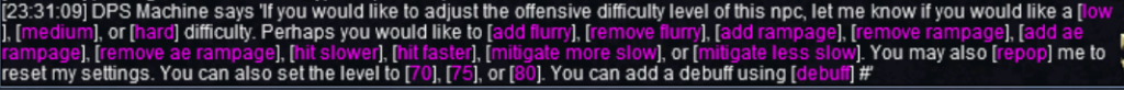 We added level adjustments and debuffs to the DPS Machine in the arena. This will allow you to mimic some GoD bosses including Tacvi trash. (Example, an_elite_mastruq_berserker set to Hard, Level 70, and add AE rampage).
